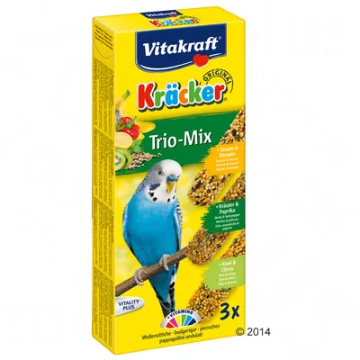 Vitakraft Kräcker finns som Trio-Mix med tre olika sorter i varje förpackning för extra mycket omväxling: Sesam & banan, Örter & paprika och Kiwi & citrus eller Trio-Mix med Ägg & gräsfrön, Aprikoser & fikon samt Honung & sesam.
